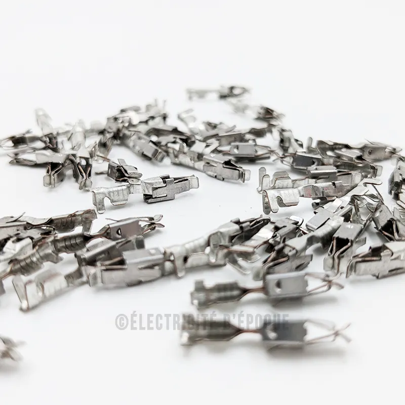 Cosse nue en laiton ou étamée. Ce sont les cosses de type origine, installées par les constructeurs. Elles sont à sertir avec les bons embouts en fonction de la section du fil utilisé. Les cosses étamées sont soudables facilement. On les reconnaît à leur aspect gris. Pour isoler ces cosses, il faut les embouts en caoutchouc correspondant ou utiliser de la gaine thermorétractable.