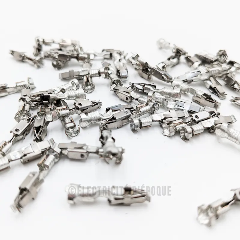 Cosse nue en laiton ou étamée. Ce sont les cosses de type origine, installées par les constructeurs. Elles sont à sertir avec les bons embouts en fonction de la section du fil utilisé. Les cosses étamées sont soudables facilement. On les reconnaît à leur aspect gris. Pour isoler ces cosses, il faut les embouts en caoutchouc correspondant ou utiliser de la gaine thermorétractable.